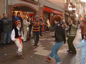 Al voltant de la plaça s’hi ha bastit grades per al públic, com un gran envelat a l’aire lliure. En arribar a la plaça entra el Capità de Cavalls i demana permís a les autoritats per ocupar-la, Un cop concedit entren el Vell i la Vella, uns personatges grotescos de la comparsa que presidiran l’acte. El Vell fa un discurs carnavalesc. En acabar, una traca assenyala 1’entrada dels diablots que, fent tabola i algun gag amb els esquellots i petards, fan lloc a la plaça per els balladors. Les colles del ball de gitanes entren a la plaça amb el galop d’entrada. Comencen els petits (Colla del Filferro) amb el Passeig, on es van formant les lletres S C, inicials de Sant Celoni, que ja es feien en el segle passat i la polka. Després la Vella s’engresca i surt a ballar amb el Vell. Li venen, però, els dolors del part i, assistida pels diablots, apareix un animal, cada any diferent: gat, cabra, conill, gallina.., que simbolitza el naixement de la primavera. Ara es el torn dels grans (Colla del Ferro) que es reparteixen el balls: Entrada de Ball, Jota, Contradansa, Polka, Frandola. peça sorpresa i el Vals i s’acaba la festa amb el Galop de Sortida. El públic anima els balladors durant la polka cridant Ferro! ELS BALLADORS La roba dels balladors està inspirada en els vestits antics, coneguts per la documentació fotogràfica de començament de segle i testimonis orals. Els homes vesteixen pantalons i camisa blanca i americana negra. La faixa i el barret són vermells i aquest està decorat amb una ploma. Als turmells hi porten camals amb picarols i cintes de colors. Les dones porten un vestit blanc curt i un mantó de Manila a l’esquena. Tant els balladors com les balladores toquen les castanyoles, fent dringar els picarols foragiten els mals esperits. LA COMPARSA Els personatges de la comparsa són el Capità de Cavalls que cavalca acompanyat dels seus cavallers, vestits elegantment de negre i tocats amb barret de copa. El Vell i la Vella són les autoritats de la Colla de Gitanes. El Vell és la personificació de l’Hivern i de la Vella naixerà la nova estació: la Primavera. Els representen dues persones disfressades còmicament com els avis d’abans. El Vell porta boina, bastó i no li falta ni la botellola ni el caliquenyo. La Vella porta un mocador al cap, manteleta, davantal i faldilles llargues que no oculten el seu estat de bona esperança. Els diablots, grans i menuts, porten màscara amb banyes, roba vermella i una faixa negra d’on pengen els esquellots que amb el seu soroll invoquen els mals esperits. S’encarreguen d’esvalotar el públic durant la cercavila i de mantenir l‘ordre a la plaça, on també fan befa d’algun aconteixement que hagi passat durant l’any. (INFORMACIÓN SACADA DE: L'Informatiu - Ajuntament de Sant Celoni, Febrer-2007.) |